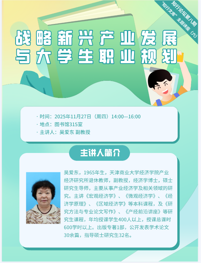 这个十一月,知行讲座为你点亮一盏灯!我们邀请到经济学院的吴爱东教授——这位刚卸下教鞭却仍心系学生的引路人,她将以经济学的理性之光剖开国家战略新兴产业的层层肌理,揭示“为什么是这些产业”的核心逻辑,更会带着真诚的关怀与你共探如何让国家战略成为个人优势的思维密码。这不是一场单向的知识灌输,而是一场双向的成长对话。讲座将通过经济学理论深度剖析我国经济发展的现实问题与未来五年产业重点方向。现场更有互动环节,帮你检验短期、中期、长期目标是否清晰明确。这场讲座是吴教授退休后依然为学生点亮的一盏灯,更是你为未来埋下的一颗希望的种子。愿你在这里,找到属于自己的未来定位。