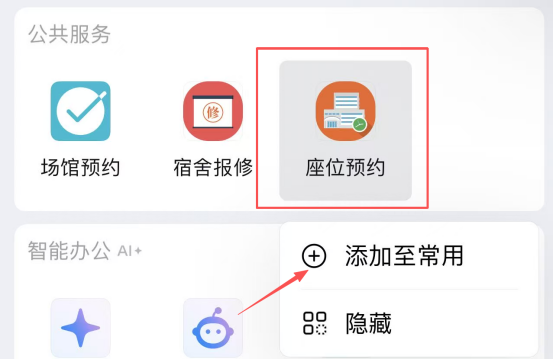 (1)企业微信:工作台—公共服务—座位预约。为了方便使用,建议把“座位预约”加到常用栏(长按“座位预约”图标,点击“添加至常用”)。